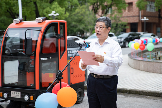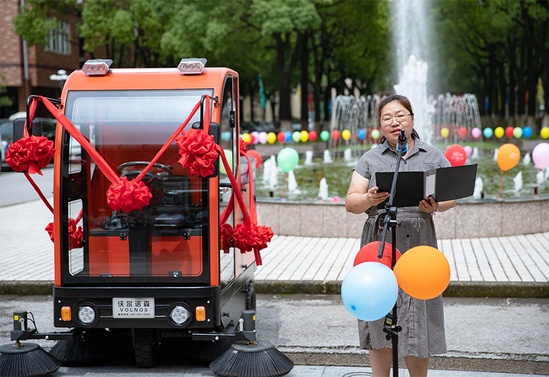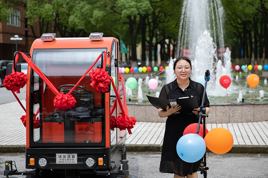 随后,学校领导与优秀毕业生代表共同为“校园清扫车”剪彩。