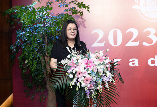 新媒体与文法学院张虹老师代表教师发言,张老师立足毕业心态的转变为同学们送去了她的祝福。在大家即将迈出人生下一步的时刻,用温婉的语气启示同学们在未来的人生路上,首先要坚持底线和规则意识,无愧无畏,坦然处世;同时,保持强烈的好奇心,在学习和实践中实现新的成长;关注生命中的“诗和远方”、享受生命的长度,探寻生活的宽度。