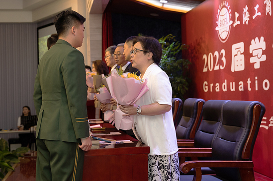 朗诵尾声,优秀毕业生代表们将一束束鲜艳的献花献给了在场的学校领导与教职工代表。至此,毕业典礼在庄重而温馨的氛围中圆满结束!