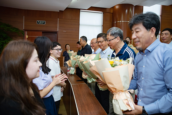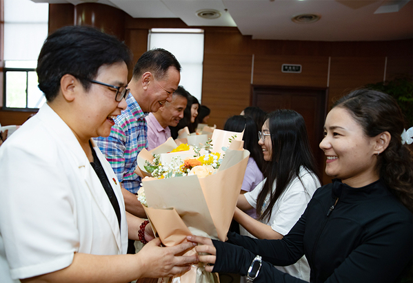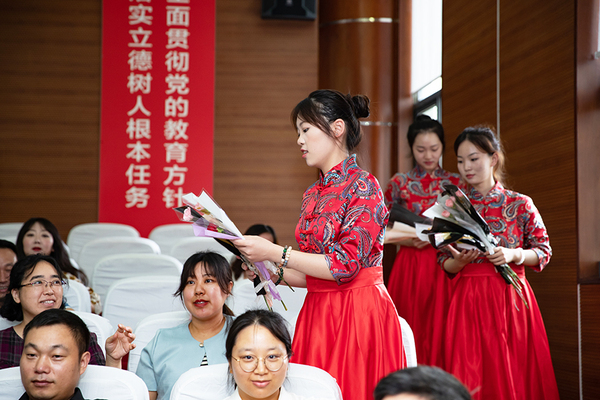 教师是阳光下最光辉的职业,人们又常称之为辛勤的园丁,鲜花无疑是园丁们最为期待和欣赏的。学校的发展离不开每一位教职员工的辛勤耕耘,更凝结着每一位教职员工的智慧力量。大会现场,新教师与学生向董事会代表、教授代表、教师代表隆重献花。献花仪式既饱含了对老师们深深的敬意和感谢,又表达了教书育人理念的薪火相传。