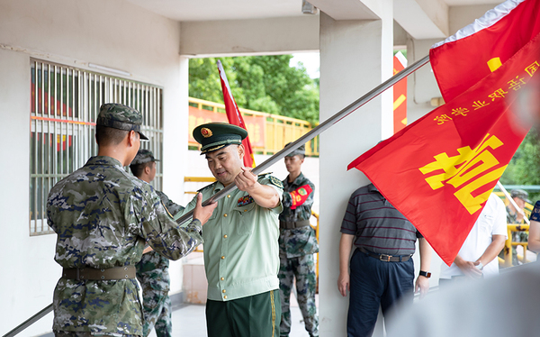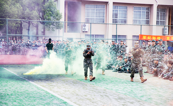 学校校长姚秀平向军训团张付军团长授予军训团团旗,军训团团长随后向各营营长授予营旗。仪式的最后环节,承训部队教官进行了队列及军事动作表演,整齐划一的队列动作和铿锵有力的擒敌拳、战术展示,征服了现场所有的师生,赢得了阵阵热烈掌声,也将开训仪式推向了高潮。