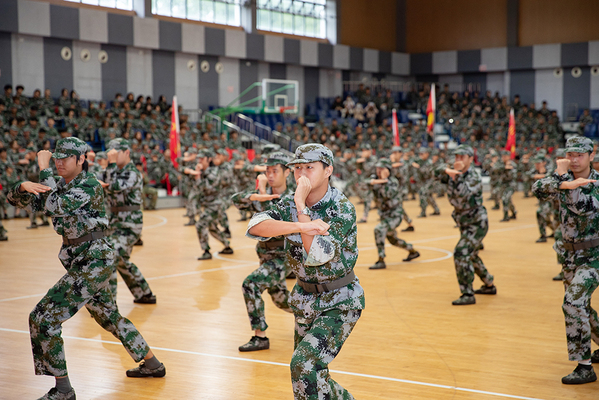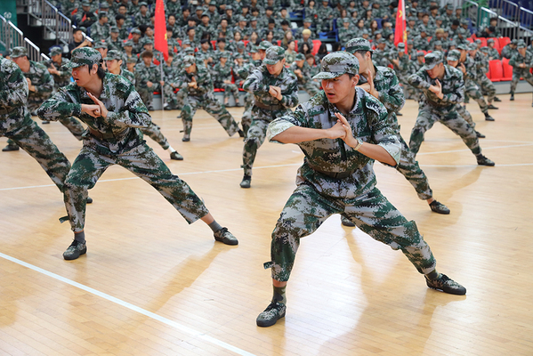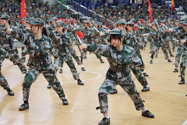 随后,男子擒敌拳方阵与女子匕首操方阵分别进行了展示,同学们眼神锐利坚定,动作干脆利落,一招一式凌厉如风,尽显英雄气概。