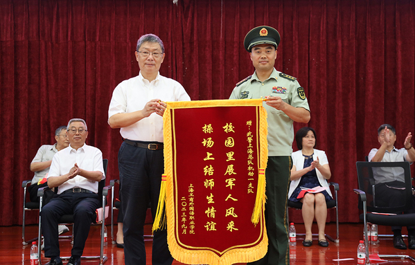 学校党委李月松书记向张付军团长赠送感谢锦旗。