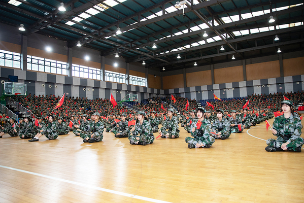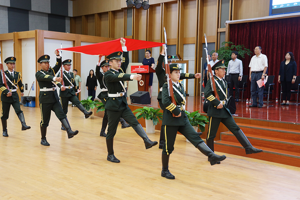 学校国旗班迈着整齐划一的步伐护卫着国旗入场,在庄严的国歌声中,开学典礼暨军训成果汇报正式拉开帷幕。