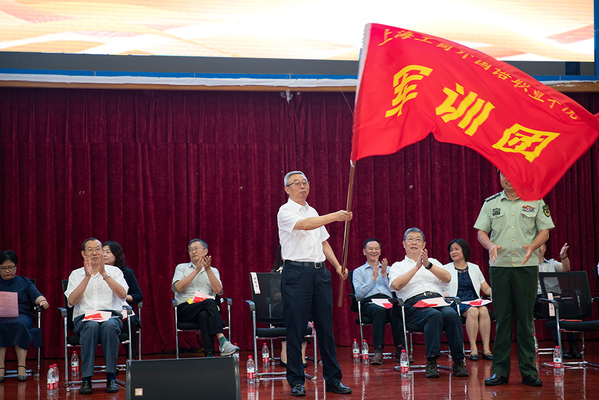 军训团张付军团长宣读优秀连队名单,校领导与各职能处室领导为优秀连队颁发锦旗。