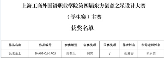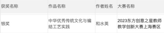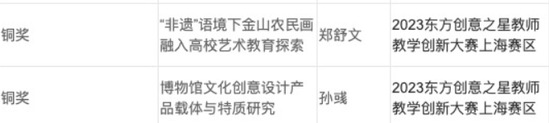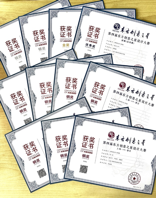近日,在刚刚落幕的2023年东方创意之星大赛上,我校创意设计学院师生表现出色,斩获多项大奖。在学生组全国赛区中荣获1铜,上海赛区中荣获1金2银6铜,共计10个奖项的好成绩。在教师组全国赛区中,和水英老师荣获铜奖;上海赛区中,和水英老师荣获银奖,王玉、郑舒文、孙彧三位老师荣获铜奖,共计6个奖项。郑舒文老师还获评优秀指导教师奖。