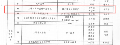 近日,由上海学生心理健康教育发展中心发起的“2023年度上海学校心理健康教育活动季”获奖名单揭晓,共评定130项短视频获得“2023年度上海学校心理健康教育活动季优秀心理健康主题短视频奖”。我校英语语言文化学院蒋子晔和杨奇雯同学的短视频作品《做不被定义的自己》荣获优秀心理健康主题短视频三等奖。
