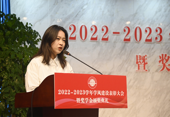 随后,来自英语语言文化学院的国家奖学金获得者王欣颖同学发言。她分享了自己进入大学后的成长感悟与收获,以“人生走过的每一步都算数,世上没有白费的努力,更没有碰巧的成功”为勉励,用辛勤的汗水浇灌成功之花。她说,从校内赛场到校外赛场,从学校奖学金到国家奖学金,是对她不断求知的肯定,更是激励自己向更高、更远目标奔赴的动力。她用简单朴实的话语将自己过去两年多的学习感悟予以交流,启发同学们在学习中要多问、多思,在行动中要勤学、勤做。