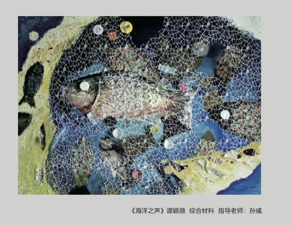 此次展览的作品涵盖了绘画、书法、设计、陶艺、布艺、编织等多个艺术领域,吸引了众多观众前来参观、驻足欣赏,为师生的无限创意与艺术成果点赞。参展的近百件作品,每一件作品都凝聚了师生的心血与智慧,展现出独特的创意与艺术魅力。其中也不乏引人深思的作品,例如:一件以废旧瓶盖和报纸制成的综合材料艺术作品《海洋之声》,寓意着环保的主题;另一系列作品《逃出大英博物馆》则是利用当代热门话题进行创作,展示了画者对海外文物早日回家的期盼。参观过程中,创作师生也现场分享了作品的灵感来源、创意思路、绘画过程和经验收获。