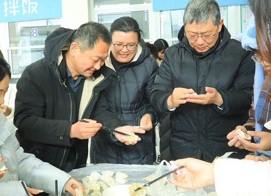 今日冬至,室外寒风凌冽,学校北区食堂二楼热闹而温馨,党委书记李月松,副书记、副校长段仁启,学生处处长陈瑜以及各二级学院师生代表齐聚一堂包饺子。带着不同地区特色、形状各异的饺子,展现的是一样的乡土羁绊与思乡之情。