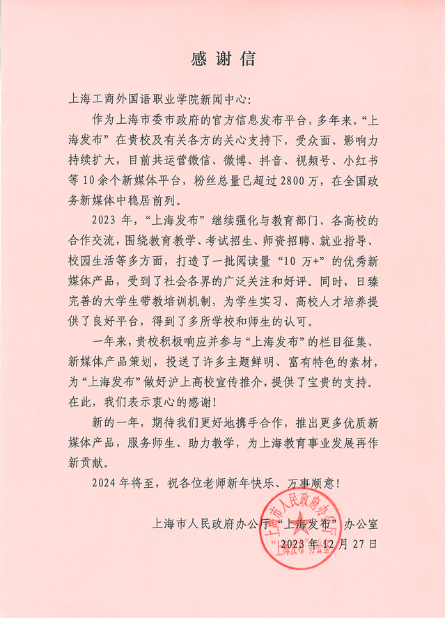 12月29日,学校收到上海市人民政府办公厅“上海发布”办公室发来的感谢信,感谢我校积极响应并参与“上海发布”的栏目征集、新媒体产品策划,投送了一系列主题鲜明、富有特色的素材,为“上海发布”做好沪上高校信息宣传推介,提供了宝贵支持,希望新的一年里能更好携手合作,推出更多优质新媒体产品,服务师生、助力教学,共同为上海教育事业发展再作新贡献,并祝我校师生新年快乐,万事顺意!