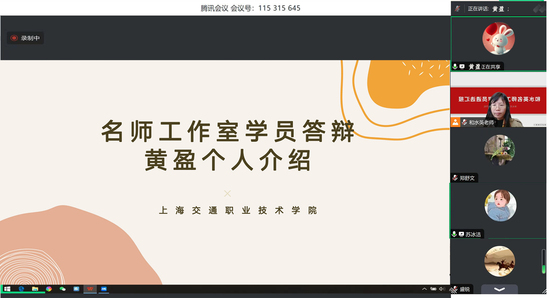 为紧密对接上海市教育委员会关于推进第二批上海市高职名师工作室项目建设任务,和水英名师工作室学员面试遴选活动于4月25日通过线上腾讯会议形式成功举办。本次活动特邀上海工艺美术职业学院第一批上海市高职名师工作室负责人盛锐教授,作为答辩评审参与工作。参与面试遴选的学员来自上海交通职业技术学院、上海工商职业技术学院、上海电子信息职业技术学院等四所高职院校。