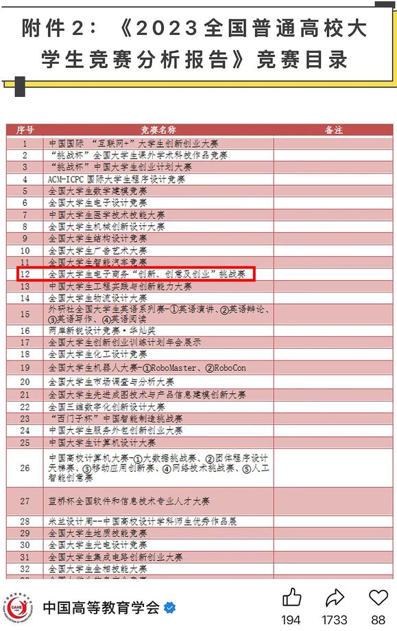 本届全国大学生电子商务“创新、创意及创业”挑战赛共有23万余支团队参与,再创历史纪录。该赛事是国内最具影响力的A类学科竞赛之一,由教育部于2009年发起,至今已成功举办十五届。在最新的《全国普通高校大学生竞赛分析报告》的84项A类赛事中高居第12位,并在全国高校大学生学科竞赛排行榜的“创新创业类赛事”中位列前三。