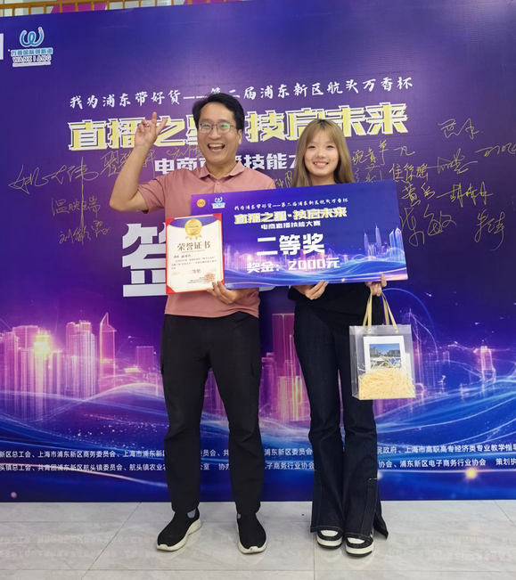 9月24日,第二届浦东新区航头万香杯直播之星・技启未来电商直播技能大赛决赛圆满落幕。我校商学院电子商务专业章力文、凡晓同学和关务-贯通专业张伊妮同学组成的浦浦通团队,经过三个月的激烈比拼,从全国300多支参赛队伍中脱颖而出,获得二等奖。