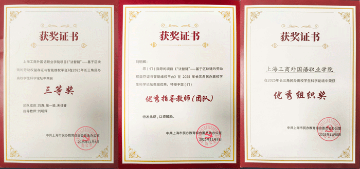 近日,由上海市民办高校党工委指导、上海杉达学院主办的2025年长三角民办高校学生科学论坛在上海杉达学院金海校区谢希德堂举行。我校人文与教育学院法律事务专业学生刘真、张一诺、朱佳睿组成的团队,凭借作品《“法智链”——基于区块链的劳动权益存证与智能维权平台》荣获三等奖;团队指导教师刘明辉获评优秀指导教师;学校获中共上海市民办教育综合委员会办公室颁发的优秀组织奖。