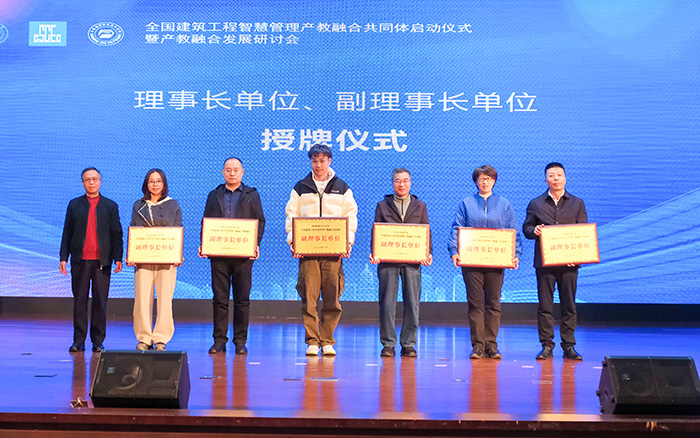 在全场嘉宾的共同见证下,9位领导嘉宾携手按下启动按钮,全国建筑工程智慧管理产教融合共同体正式成立。