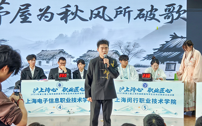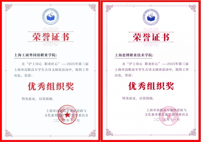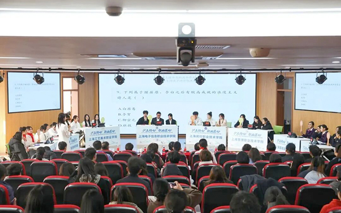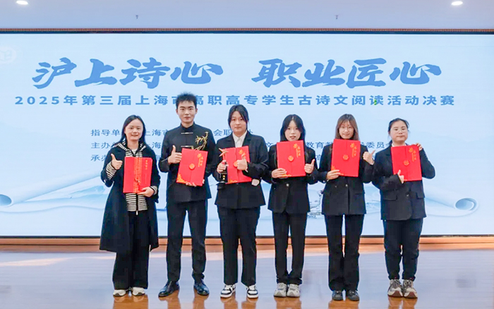 11月28日,“沪上诗心 职业匠心”2025年第三届上海市高职高专学生古诗文阅读活动决赛在上海闵行职业技术学院落下帷幕。学校卫生技术与护理学院涉外护理专业陈颖、商学院关务专业吴奕庭、英语专业楼晨、国商专业韩涵、艺术设计与传媒学院编导专业张耀文五位同学组成的参赛团队,在语委杨海燕老师和人文与教育学院甘露老师的悉心指导下,与全市8所高职高专院校的选手同场比拼,发挥出色,最终荣获大赛铜奖。此外,上海工商外国语职业学院与上海思博职业技术学院同时获评优秀组织奖。