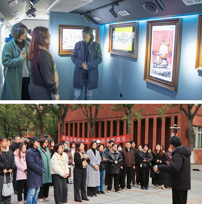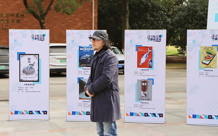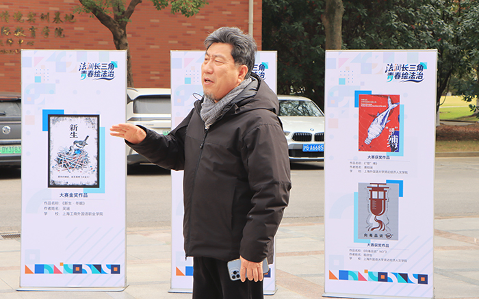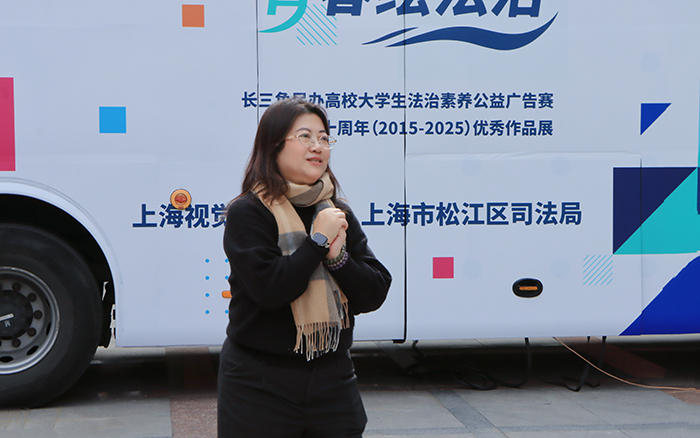 随后,上海视觉艺术学院陈耀明教授详细介绍了该项赛事的发展历程与特色。他回顾了十年来赛事在长三角民办高校间产生的广泛影响,并重点讲解了本次巡展车的策划理念与展陈内容。车内集中展示了十年来积累的优秀法治公益广告作品,将法治理念转化为可感可知的视觉语言。陈教授同时积极鼓励在场学生参与于2026年举办的下一届赛事,在实践中深化对法治精神的理解。