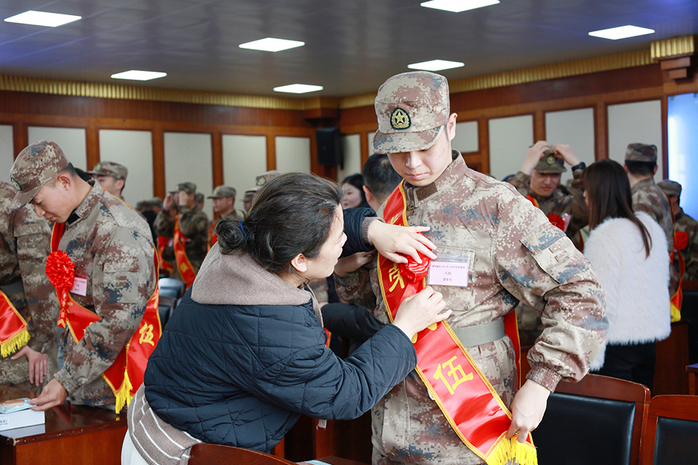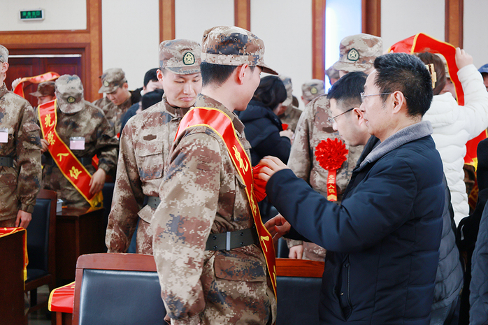 随后,学校教师为新兵佩戴光荣入伍红花。